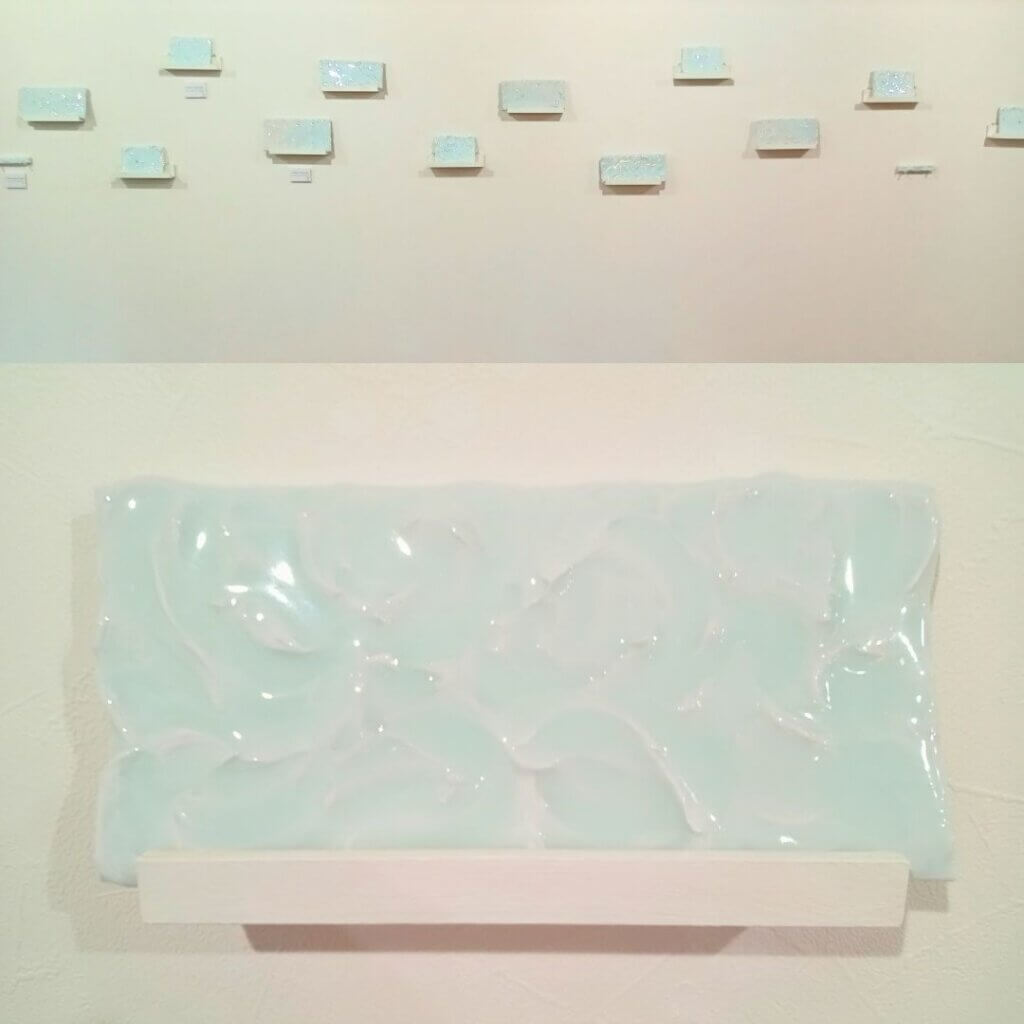 壁に展示した磁器は、指でニュアンスを付けて焼いた作品「Creme Chantilly」正にホイップクリームそのもの。ケーキやデザートが似合いそうな器です。